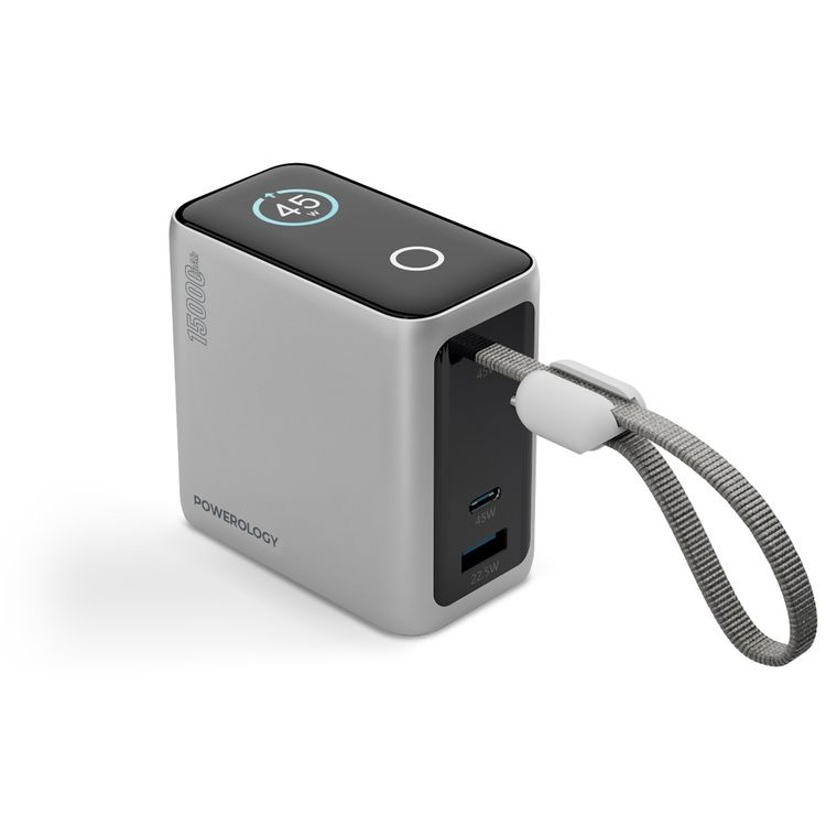 بنك الطاقة المصغر من Powerology بسعة 15000 مللي أمبير مع منافذ شحن متعددة، توافق عالمي، ميزات أمان متقدمة، شاشة تي إف تي ذكية، كابل USB-C مدمج - أسود