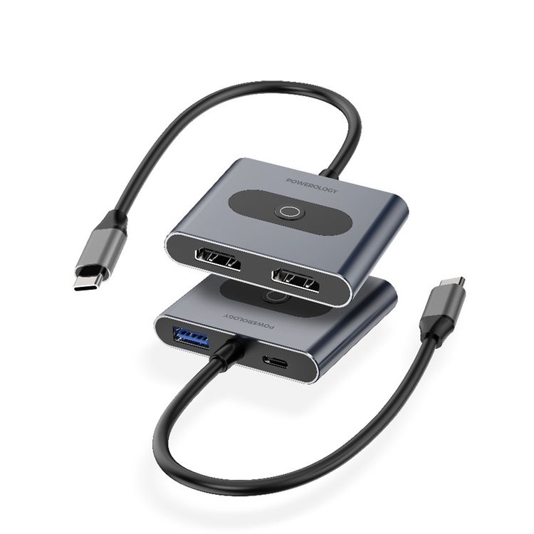 Powerology موزع متعدد الوظائف 4 في 1 بمنفذ USB-C، هيكل من سبائك الألمنيوم، متوافق مع ويندوز 10/11، macOS 10.10+، أندرويد 6.0+ مع وضع USB-C DP Alt، قدرة توصيل طاقة 100 واط، قابل للتوصيل والتشغيل، تصميم محمول - رمادي