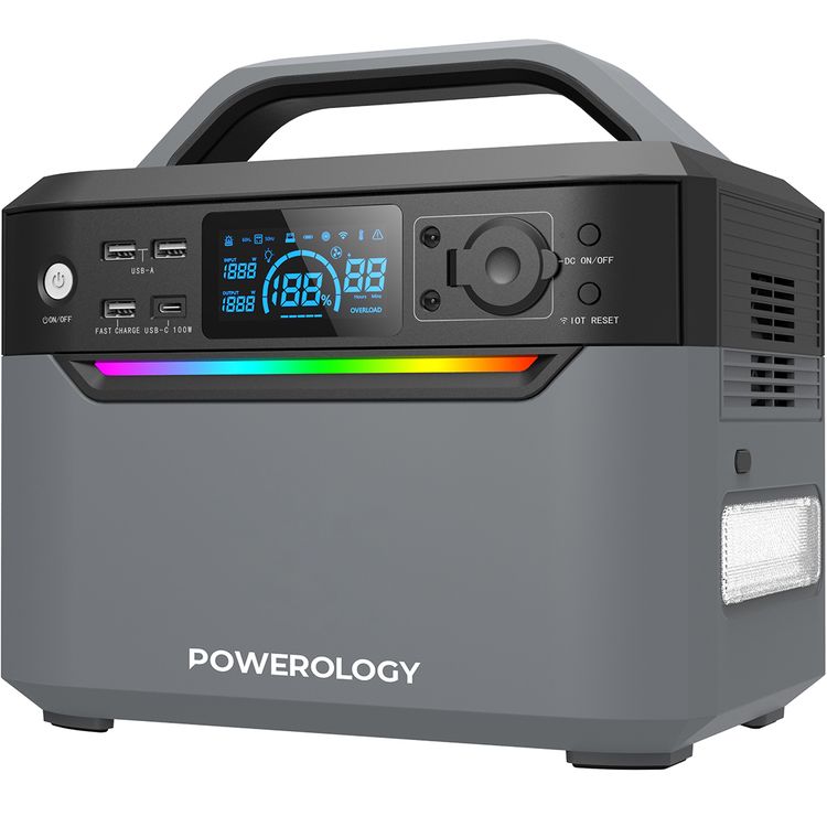 مولد طاقة باورولوجي 600 واط مع مقبسين تيار متردد مزدوجين، منفذ USB-C، منفذين USB-A ومخارج لاسلكية، مصباح مدمج، سعة بطارية 120000 مللي أمبير، قدرة شحن بالطاقة الشمسية، تصميم محمول - أسود.