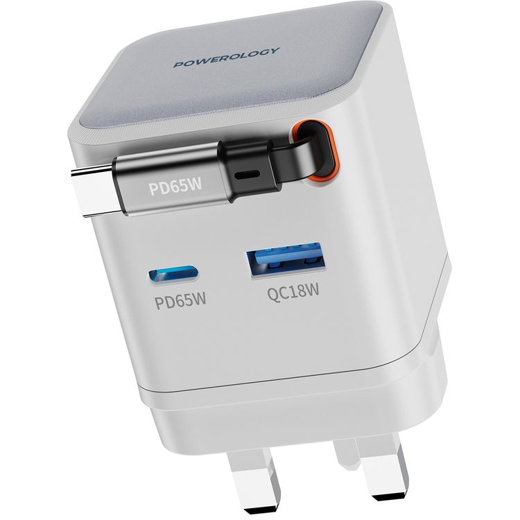 شاحن باورولوجي بثنائي المنافذ قابل للسحب بتقنية GaN، مع ضمانات مدمجة، شحن لثلاثة أجهزة، توصيل طاقة بقوة 65 واط، مصنوع من مواد مقاومة للحريق، تصميم محمي ببراءة اختراع، كابل نوع-C قابل للسحب بطول 75 سم - أبيض.
