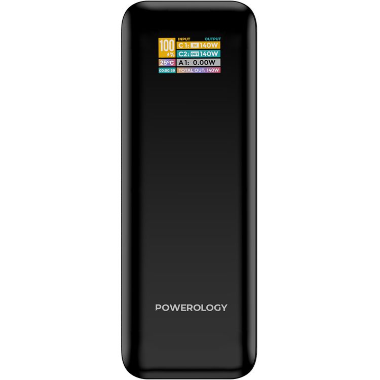 بنك الطاقة باورولوجي نيوروفولت 140 بسعة 27000 مللي أمبير في الساعة، مزود بمنافذ USB-A وUSB-C مزدوجة، توصيل طاقة 140 واط، مصنوع من مواد مقاومة للاشتعال، شحن متزامن، حماية مدمجة، عرض رقمي، شحن سريع - باللون الأسود.