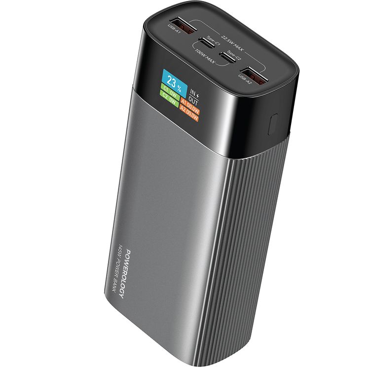 بنك الطاقة Powerology VoltEdge بسعة 40000mAh مع شاشة معلومات ذكية، شحن متعدد الأجهزة، شحن فائق السرعة، حماية مدمجة، 2×USB-A و2×USB-C - اللون رمادي