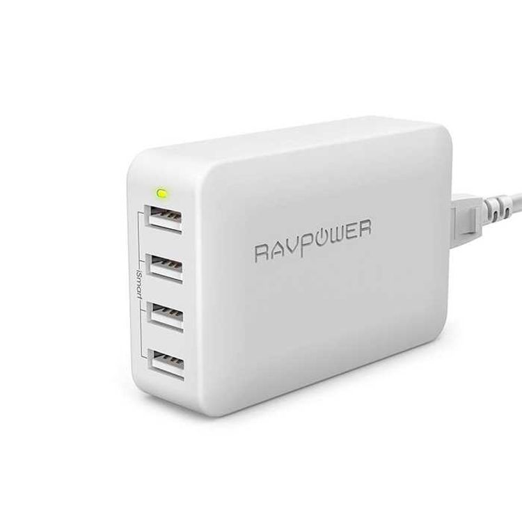 RAVPower 4-Port USB Travel Adapter 40W with Power Cord & Detachable Adapters - Portable & Sturdy Fast Charging Wall Charger with iSmart Technology & Multiple Protection - White