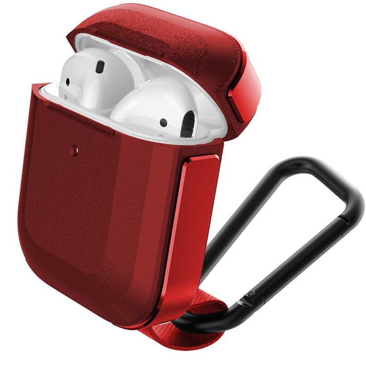 X-Doria Defense Trek Aluminum Bumper Case with Anti-Lost Carabiner & Loop Compatible for AirPods 1 & 2 - Sleek Design Cover - 360 Degree Protection - Charging Light Visible - Red