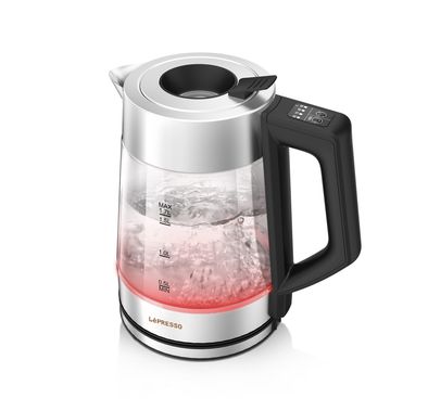 توصيل مجاناغلاية زجاجية مضيئة من LePresso، سعة 1.7 لتر، قدرة كهربائية 2200 واط، مقبض مريح، تسخين سريع، خيار الحفاظ على الحرارة، حماية من الغليان الجاف - أسودمخزون159.00