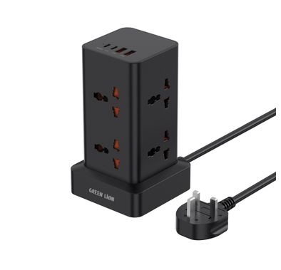 برج الطاقة جرين ليون 2500 واط، تصميم عمودي مع 8 مقابس تيار متردد، 2 مداخل Type-C و2 مداخل USB-A، قدرة شحن سريعة 20 واط، حماية مدمجة ضد الحمل الزائد وارتفاع الجهد الكهربائي، قابس بريطاني 3 دبابيس مع سلك بطول 2 متر، شحن متعدد الأجهزة – أسود.