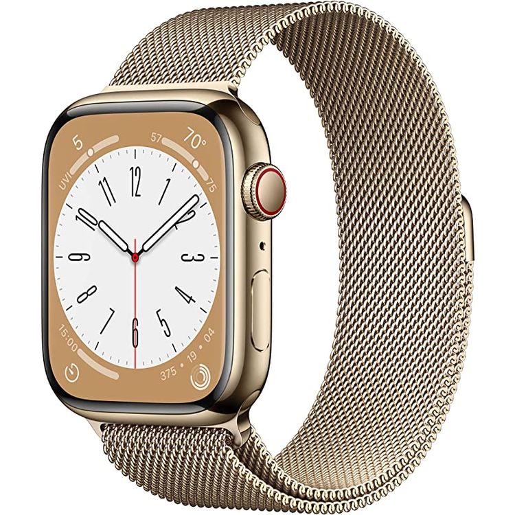 ساعة أبل الإصدار 8 (جي بي إس + خلوي) - هيكل ذهبي من الفولاذ المقاوم للصدأ، حزام ميلاني ذهبي - 45 ملم