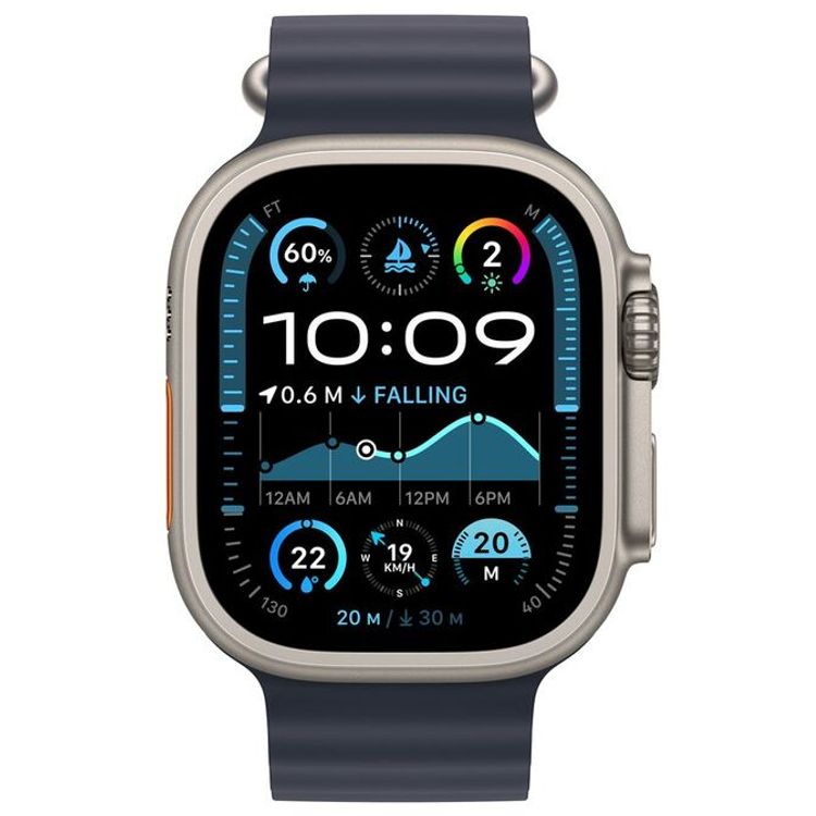 ساعة آبل ووتش ألترا 2 2024 بنظام GPS + Cellular 49mm بعلبة من التيتانيوم الأسود مع سوار أوشن باللون الأسود، قياس عادي - تيتانيوم أسود.