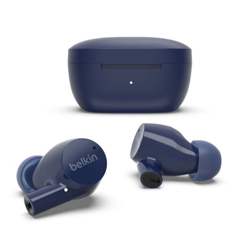 سماعات Belkin Soundform Rise اللاسلكية الحقيقية مع أحجام متعددة لرؤوس الأذن، صوت ستيريو غني، اقتران تلقائي، حقيبة شحن مدمجة وقابلة للتنقل، متوافقة مع المساعدات الصوتية، مقاس السائق 6 ملم - أزرق