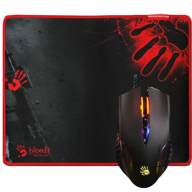 حزمة فأرة الألعاب Bloody Neon X'Glide مع لوحة فأرة بدقة تصل إلى 6200 نقطة في البوصة، وعمر زر يصل إلى 10 ملايين نقرة، ولوحة مطاطية غير قابلة للانزلاق، و3 تأثيرات إضاءة نيون - باللون الأسود.