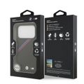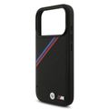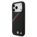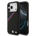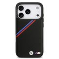 غطاء BMW MagSafe من جلد PU مع شعارات معدنية وخطوط مائلة ثلاثية الألوان لجهاز iPhone 17 Pro، حماية من السقوط، تغليف مستدام، تصميم سهل التثبيت، نحيف المظهر - أسود