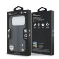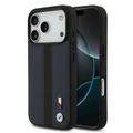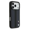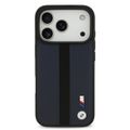 حافظة BMW بجلد PU مع خطوط مثقبة وشعارات معدنية لهاتف iPhone 17 Pro Max، متوافقة مع MagSafe، تغليف مستدام، حماية من السقوط، تصميم نحيف، تصميم سهل التركيب - لون كحلي / أسود