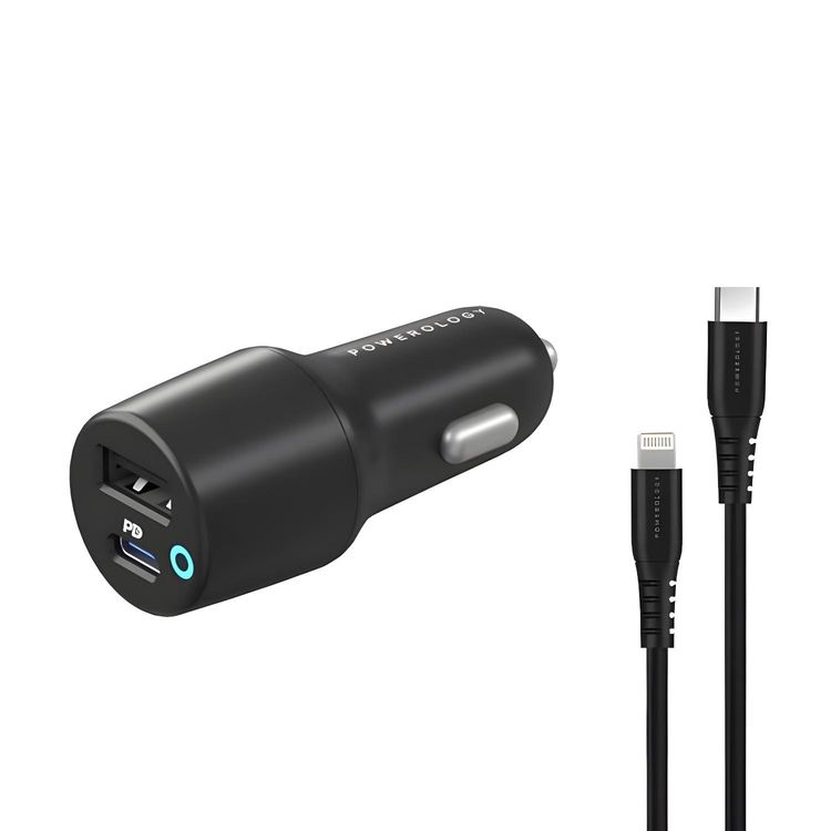 شاحن سيارة باورولوجي ثنائي المنفذ مع تقنية PD 20 وات، ومنافذ USB-A وUSB-C، وكابل USB-C إلى Lightning، وطول الكابل 90 سم، وPower Dash 3.0، وشحن سريع - أسود