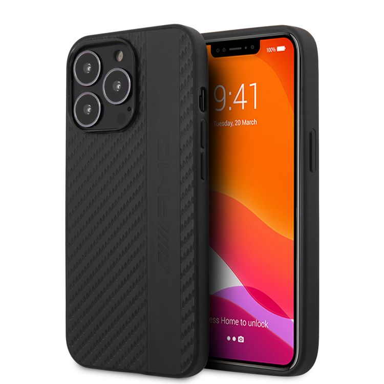 CG MOBILE AMG PC/TPU Case with PU Carbon Effect Gray Leather Stripe & Hot Stamped Logo Compatible for iPhone 13 Pro Max (6.7") Easy Access to All Ports, Shock-Absorption, Anti-Scratch, & Drop Protection Back Cover Suitable with Wireless Charging Officially Licensed