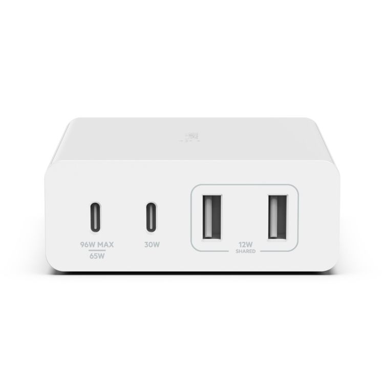 محول شاحن من بيلكن (WCH010MYWH) شاحن GaN 4 منافذ 2x يو اس بي-سي 2x يو اس بي. قم بالوصول إلى منفذي يو اس بي-سي ومنفذي يو اس بي لتشغيل كمبيوتر محمول و 3 أجهزة إضافية باستخدام شاحن GaN بقدرة 108 وات بأربعة منافذ. معبأة بـ يو اس بي PD و GaN وتقنيات أخرى لشحن قوي وفعال. مصمم للجلوس على مكتب لسهولة الوصول إلى المنفذ. - أبيض
