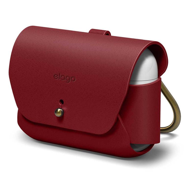 Elago Genuine Leather Case Compatible with Apple Airpods Pro, Vintage Design, Supports Wireless Charging, Brass Ring Holder, Anti-Slip Case, Shock Proof, Bring as Keychain - Red