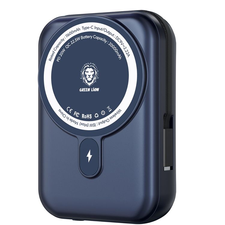 بطارية متنقلة جرين ليون بسعة 20000 مللي أمبير/ساعة مع كابل مدمج من النوع C، شاشة LCD، توصيل طاقة 20 واط، جاذبية مغناطيسية، تصميم مدمج - أزرق