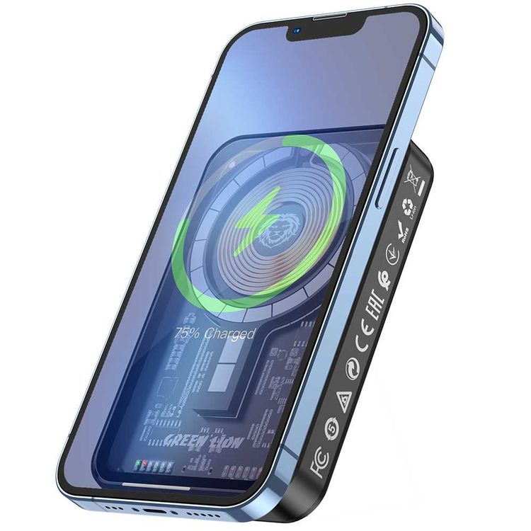 باور بانك ماجسيف شفاف 3 في 1 من جرين ليون، مخرج لاسلكي 15 وات، 5000 مللي أمبير في الساعة، PD 20 وات، مخرج لاسلكي من النوع C مع حامل جلدي - أسود