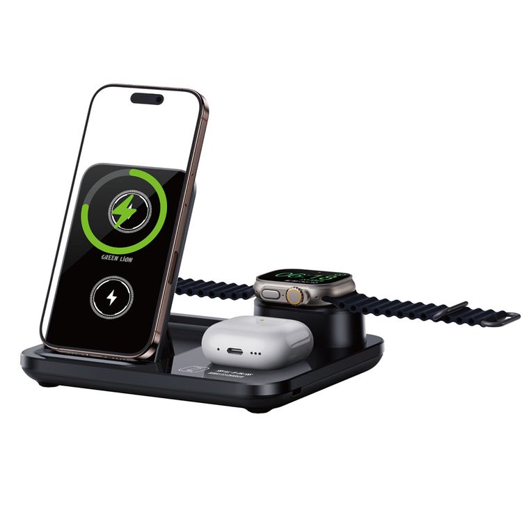 شاحن لاسلكي Green Lion 3 في 1 مع شحن الهاتف، شحن AirPods، شحن iWatch، واجهة Type-C، تشغيل باللمس، تصميم مريح، مادة ABC + PC