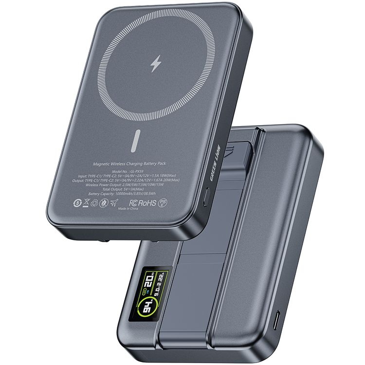 جرين ليون أسترو باور بانك 10000 مللي أمبير 3 في 1 مع مخرج USB-C مزدوج، مخرج لاسلكي، تصميم نحيف للغاية، حامل مدمج، كابل مدمج، معتمد للطيران - رمادي