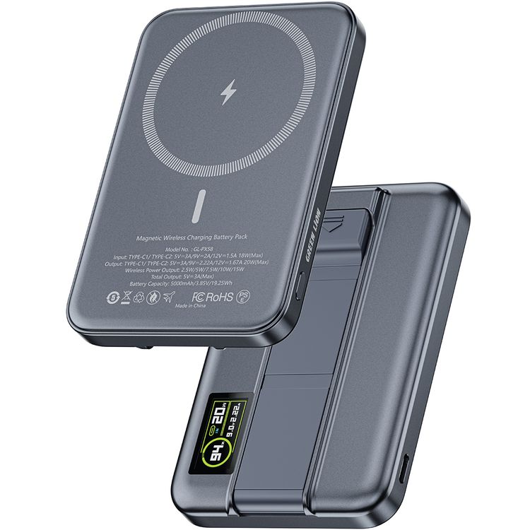 جرين ليون أسترو 5000 مللي أمبير ساعة باور بانك 3 في 1 مع مخرج USB-C مزدوج، إخراج لاسلكي، تصميم نحيف للغاية، حامل مدمج، كابل مدمج، معتمد للرحلات - رمادي
