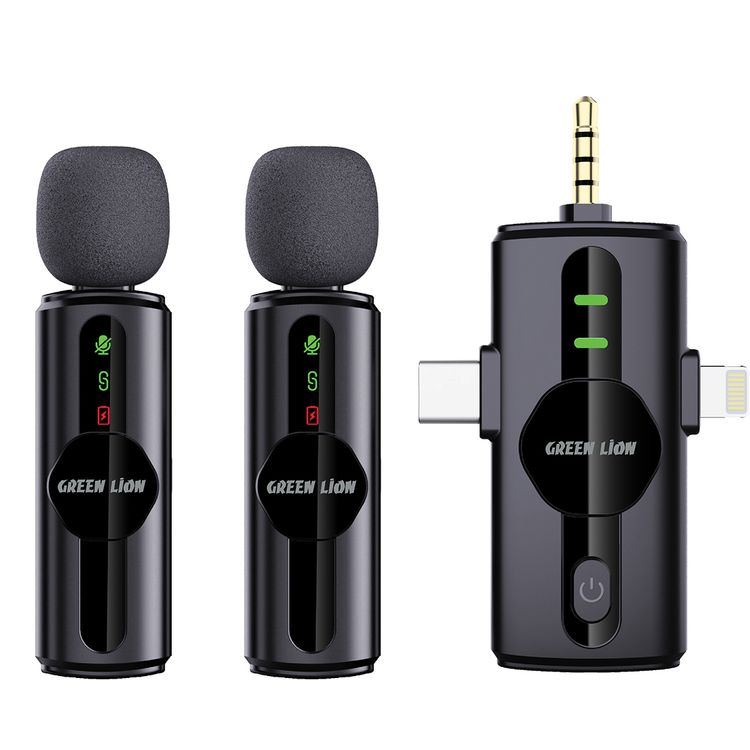 ميكروفون Green Lion GM-80X مع ميزة إلغاء الضوضاء بثلاث مستويات، وقت عمل يصل إلى 5 ساعات، زمن استجابة أقل من 30 ميلي ثانية، ميكروفونات مزدوجة، موصلات Type-C و AUX و Lightning - لون أسود