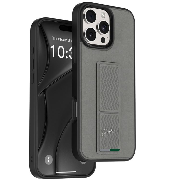 جراب Green Lion Gripx متعدد الوظائف مع مسند لهاتف iPhone 16 Pro، ملمس ناعم، مضاد للخدش، حماية من السقوط، حواف مرتفعة، حماية للكاميرا - رمادي