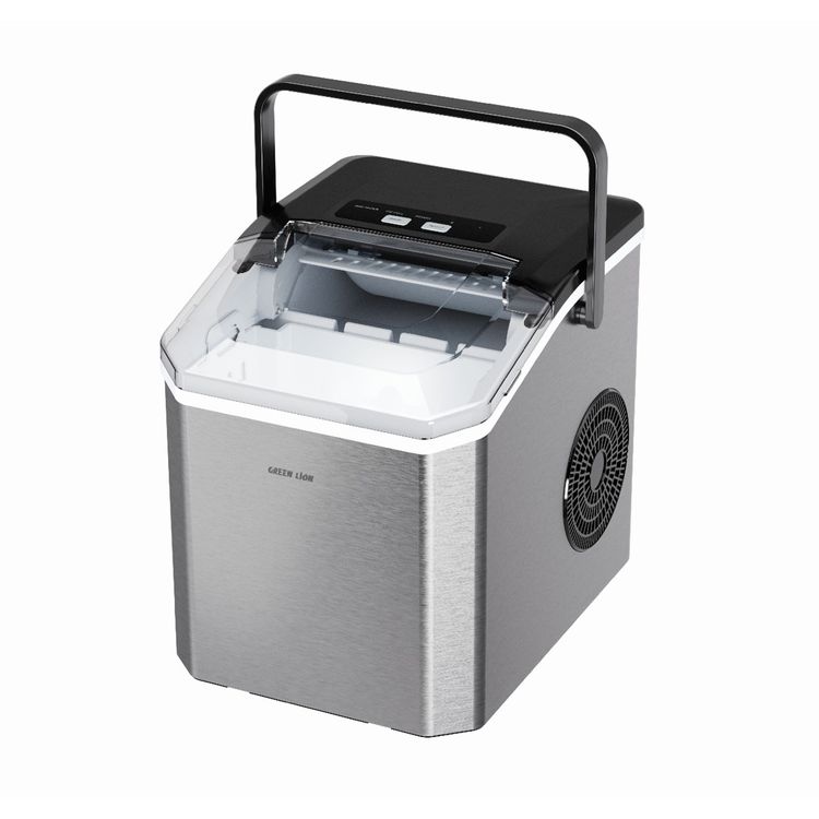 صانع الثلج الفوري جرين ليون آيس ميت مع شاشة تحكم باللمس، قدرة طاقة مصنفة 130 واط، سعة خزان مياه 1.3 لتر، سعة سلة الثلج 0.5 كجم، قابس BS بطول 1.2 متر، رصاصات صغيرة وكبيرة، مؤشر إضافة الماء ومؤشر امتلاء الثلج.