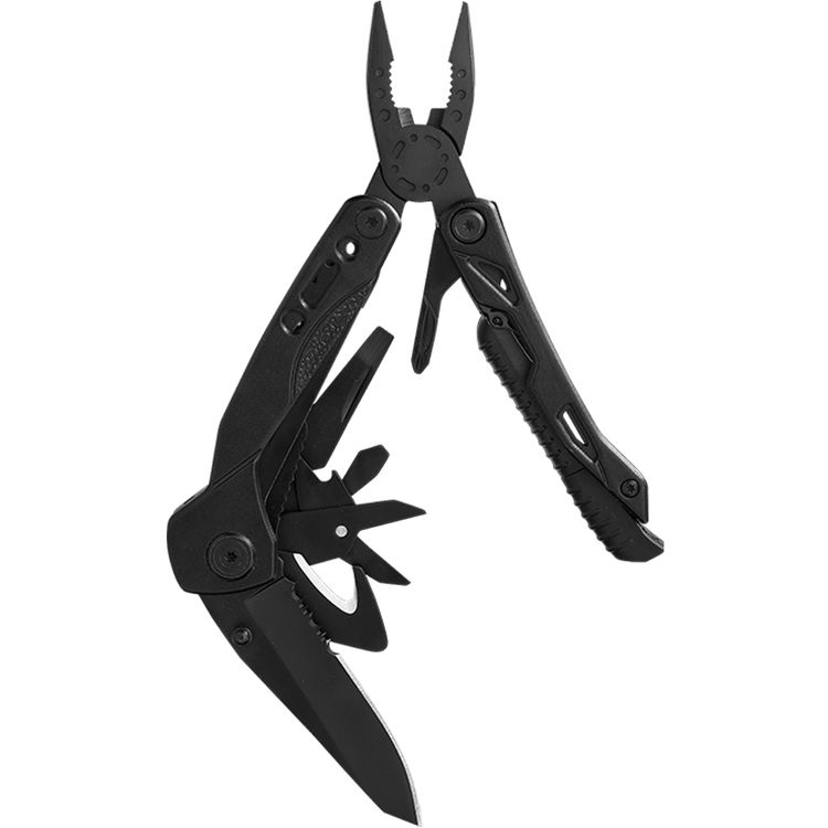 أداة متعددة الوظائف جرين ليون بليير برو مع مواد من الألومنيوم والفولاذ المقاوم للصدأ، طول النصل 2.8 بوصة، كماشة ذات أنف طويل، كماشة قياسية، قاطع سلك، مفك مسطح، صافرة، مبرد أظافر، فتاحة زجاجات، مقص، قاطع حبال، مجموعة، منشار، شفرة سكين، مفك فيليبس، كما تحتوي الأدوات على مُشعل نار - اللون أسود