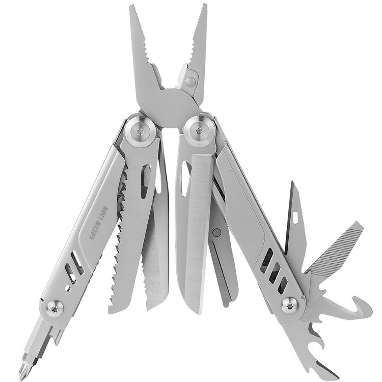 مجموعة أدوات متعددة من جرين ليون، X 15 في 1، مصنوعة من الفولاذ المقاوم للصدأ، تتضمن كماشة، فتاحة زجاجات، منشار، مقص، مفك براغي، سكين، قاطع حبال، وقاطع أسلاك.