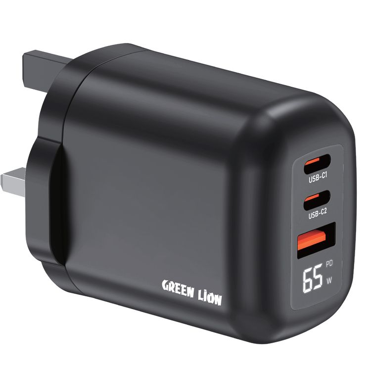 شاحن حائط جرين ليون Q-SERIES بقوة 65 واط مع قابس UK، يحتوي على منفذين Type-C ومنفذ USB-A، شحن سريع، من مادة PC مقاومة للحريق، شاشة عرض في الوقت الحقيقي، تقنية GaN عالية الكفاءة - أسود.