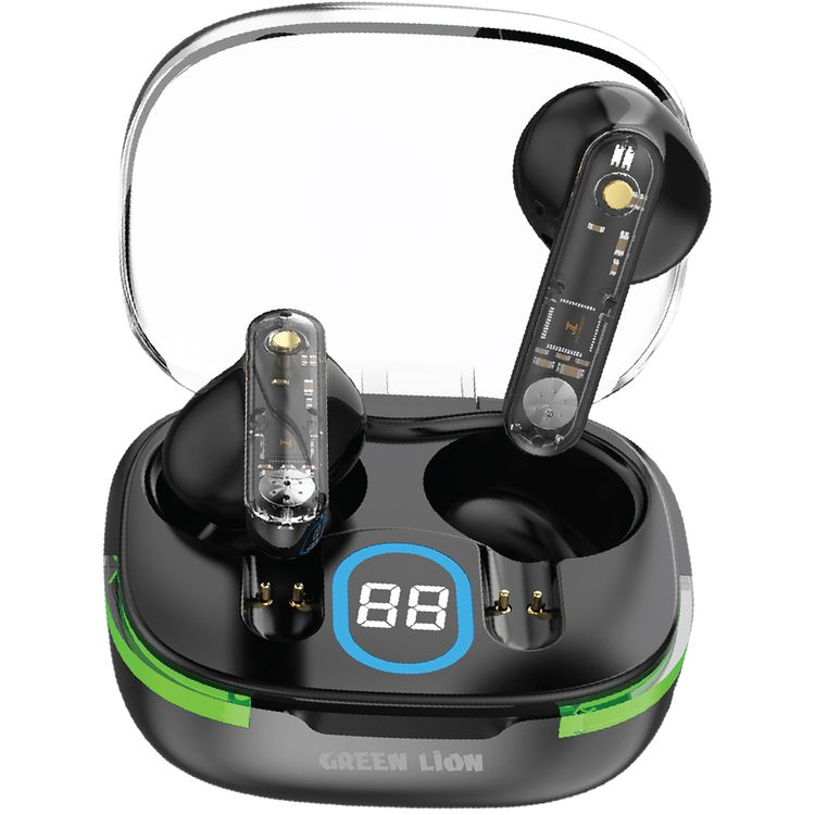 سماعات الأذن اللاسلكية الحقيقية من Green Lion Vegas مع أضواء تنفس، مستوى مقاومة الماء IPX4، عرض رقمي، صوت عالي الدقة، ميكروفون مزدوج، تحكم باللمس، 4 ساعات من وقت التشغيل - اللون الأسود.