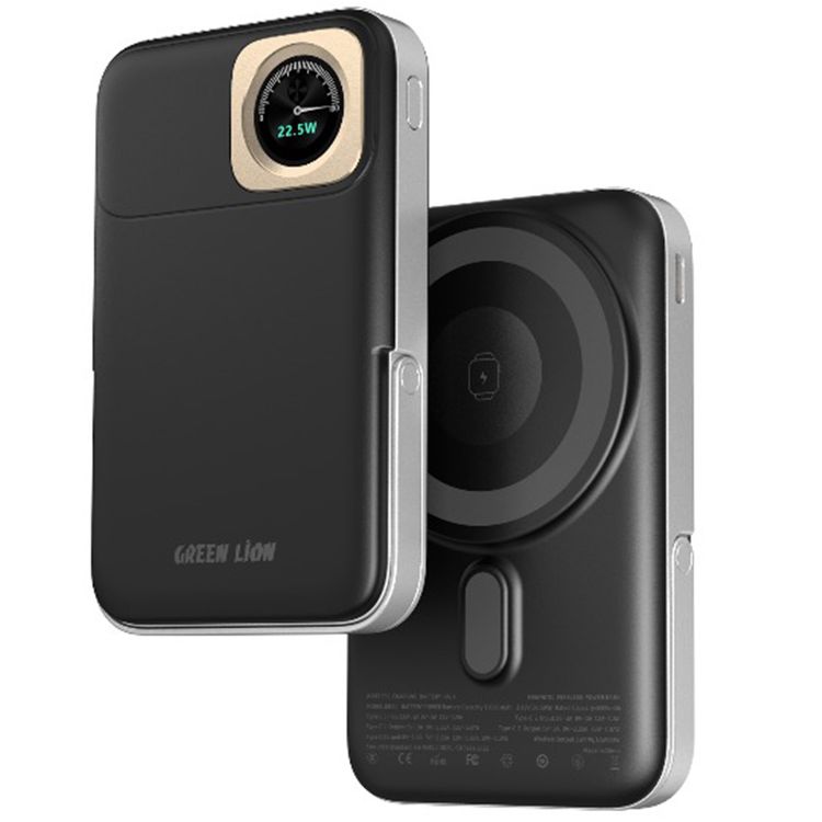 بنك الطاقة الأخضر لايون فولت جاج 10000 مللي أمبير مع منفذين USB-C، مصنوع من مواد ABS وPC، إخراج لاسلكي 15 واط، توصيل الطاقة 22.5 واط، معتمد للطيران، حامل مدمج، دعم الشحن السريع - اللون الأسود