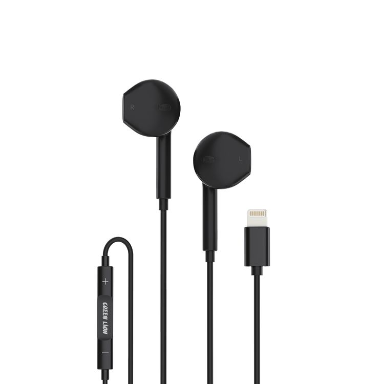 سماعات أذن سلكية استريو من Green Lion مع موصل Lightning، صوت استريو، أزرار تحكم، طول الكابل 1.2 متر، مصنوعة من مادة TPE وسلك نحاسي، حجم السماعة 14.2 مم - أسود