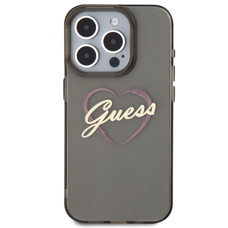 غطاء GUESS IML صلب مع شعار قلب لهاتف iPhone 16 Pro، بروفايل نحيف، سهل التركيب، قبضة مريحة، قطع دقيقة، امتصاص الصدمات، حماية من السقوط والصدمات الجانبية - أسود