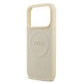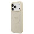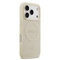 غلاف غيس ماجسيف من جلد البولي يوريثان مع شعار كلاسيكي وتصميم ختم زهري لهاتف آيفون 17 برو، بتصميم نحيف، سهل التركيب، تغليف مستدام، ملمس مريح، وحماية من السقوط - بيج