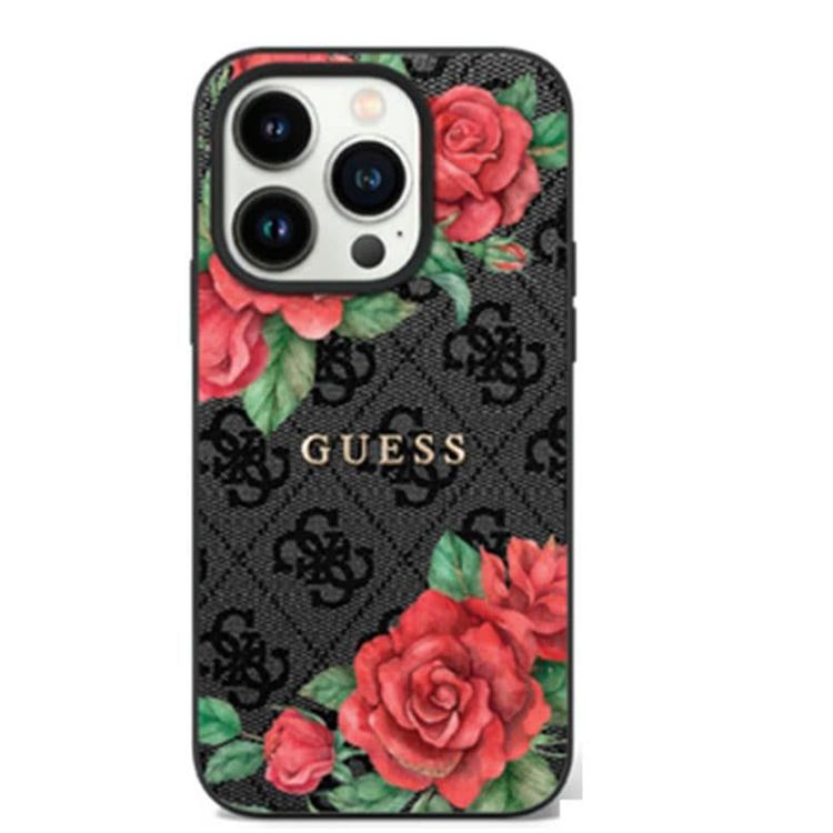 كفر Guess PU 4G الصلب بتصميم Roses Metal لهاتف iPhone 16 Pro Max سهل التركيب ومع قبضة آمنة ومريحة وحافة كاميرا مرتفع - اسود