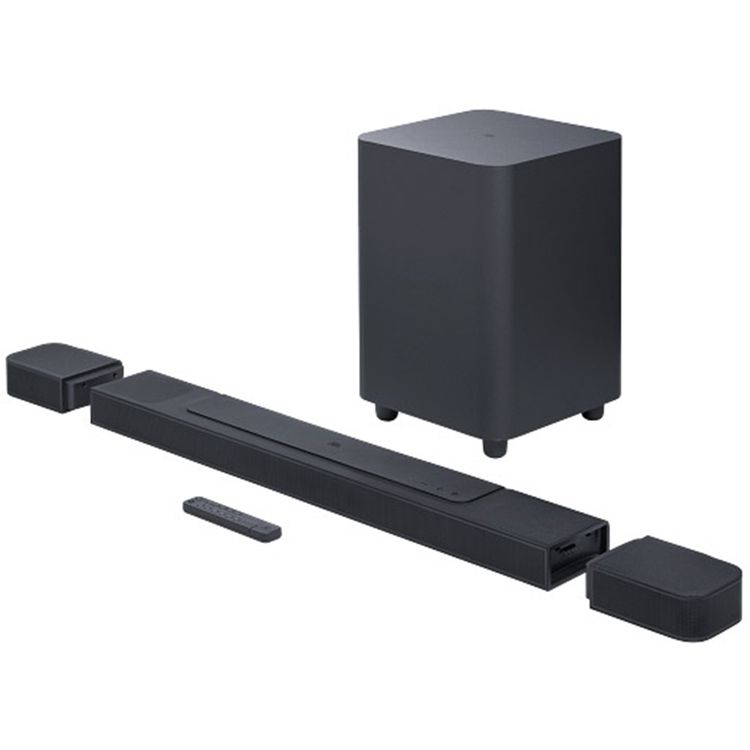 مكبر الصوت JBL Bar 1000 المزود بسماعات محيطية قابلة للفصل، بقوة إجمالية 880 واط، يدعم صيغة MP3، منفذ USB-A، درجة حرارة التشغيل من 0-45 درجة مئوية - اللون أسود.