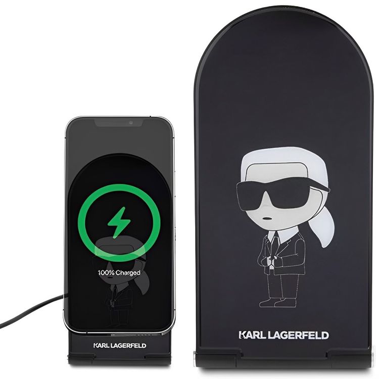 شاحن مكتبي Karl MagSafe بقوة 15 وات بتصميم شعار Ikonik، محمول وصغير الحجم، شاحن سماعات أذن، مادة متينة، سهل التركيب - أسود