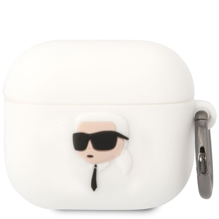 جراب كارل لاغرفيلد ثلاثي الأبعاد من السيليكون لسماعات AirPods 3، تصميم كارل غير قابل للاستبدال، خفيف الوزن، سهل التركيب، حماية من السقوط، سهل الحمل - أبيض