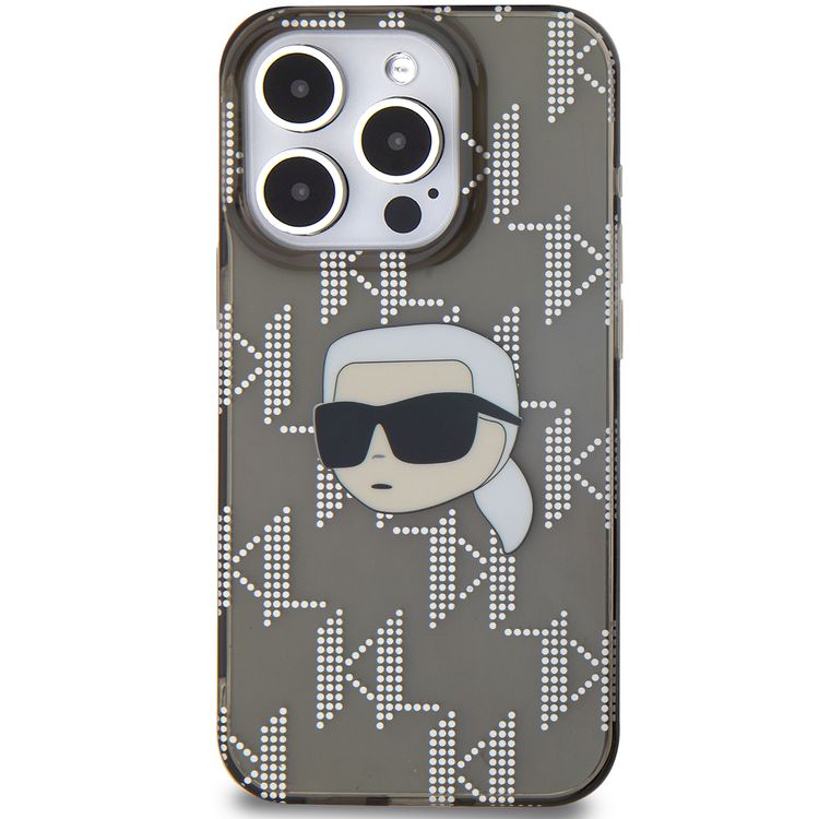 جراب Karl Lagerfeld IML الصلب مع تصميم Karl Head & Monogram مطلي بالكهرباء لهاتف iPhone 16 Pro Max - أسود