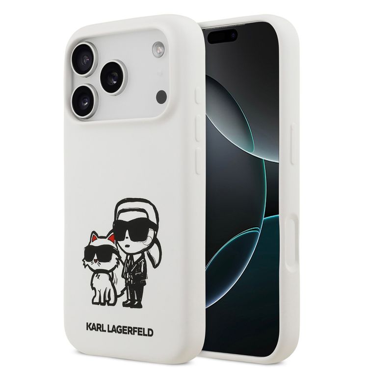 كفر كارل لاغرفيلد من السيليكون السائل مع رسم كارل وشوبت لهاتف آيفون 17 برو ماكس، حماية ضد السقوط، تصميم نحيف، تركيب سهل، تغليف مستدام، قبضة مريحة، تصميم خفيف الوزن - أبيض