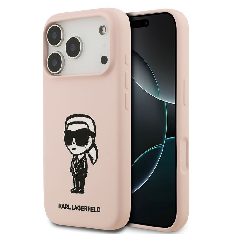 غطاء كارل لاغرفيلد السائل من السيليكون مع رسم كارل لجهاز آيفون 17 برو، قبضة مريحة، تغليف مستدام، تركيب سهل، حماية ضد الصدمات، تصميم نحيف وخفيف الوزن - وردي