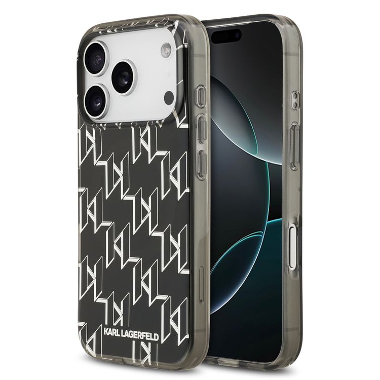 حافظة كارل لاغرفيلد MagSafe بتصميم IML مع مونوجرام كارل المتكرر بتصميم مطلي بالكهرباء لجهاز iPhone 17 Pro Max، ملف نحيف، حماية من السقوط، سهلة التركيب، تغليف مستدام، قبضة مريحة، تصميم خفيف الوزن - أسود