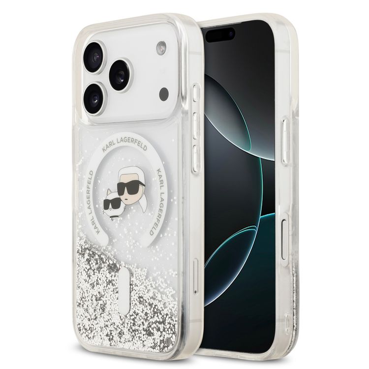 غطاء كارل لاغرفيلد ماجسيف مع سائل جليتر ورأسين لكارل وتشوبيت لأيفون 17 برو ماكس، حماية من السقوط، قبضة مريحة، تصميم نحيف وخفيف الوزن، تغليف مستدام، سهل التثبيت - شفاف