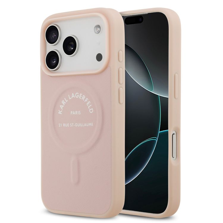 غطاء كارل لاغرفيلد ماج سيف PU مع أزرار شعار كارل RSG لهاتف آيفون 17 برو ماكس، تصميم نحيف، سهل التركيب، عبوة مستدامة، قبضة مريحة، حماية من السقوط، تصميم خفيف الوزن - وردي