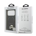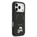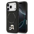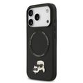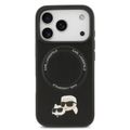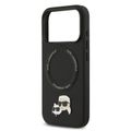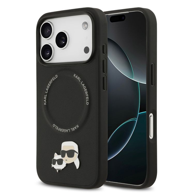 غلاف جلد PU من كارل لاغرفيلد مع دبابيس رأس كارل وشوبيتي لجهاز آيفون 17 برو، متوافق مع ماج سيف، نحيف، حماية من السقوط، قبضة مريحة، تغليف مستدام، سهولة التركيب، تصميم خفيف الوزن - أسود
