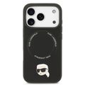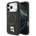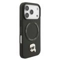 غطاء من الجلد الصناعي كارل لاغرفيلد مع دبابيس رأس كارل لهاتف آيفون 17 برو، تصميم نحيف وخفيف الوزن، قبضة مريحة، متوافق مع MagSafe، تغليف مستدام، سهل التركيب، حماية من السقوط - لون أسود