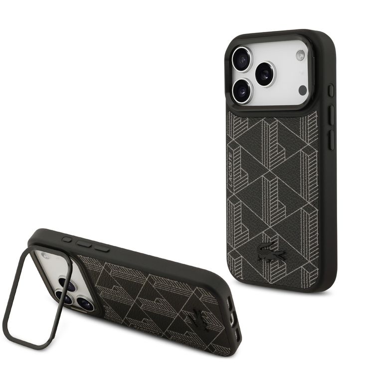 حافظة Lacoste MagSafe بغطاء من الجلد الصناعي مع شعار Monogramme وحامل كاميرا لهاتف iPhone 17 Pro، بتصميم نحيف، تغليف مستدام، حماية من السقوط، تصميم سهل التركيب - باللون الأسود