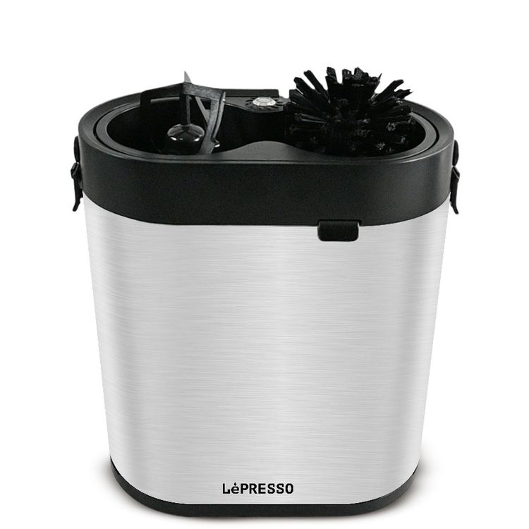 آلة تنظيف مرشح القهوة LePresso Sterilix مع مادة الفولاذ المقاوم للصدأ، نوع شفرة الكاشطة الحلزونية المثلثة، فلتر قهوة 51 و58 ملم، تصميم قابل للفصل، تشغيل بلمسة واحدة - فضي